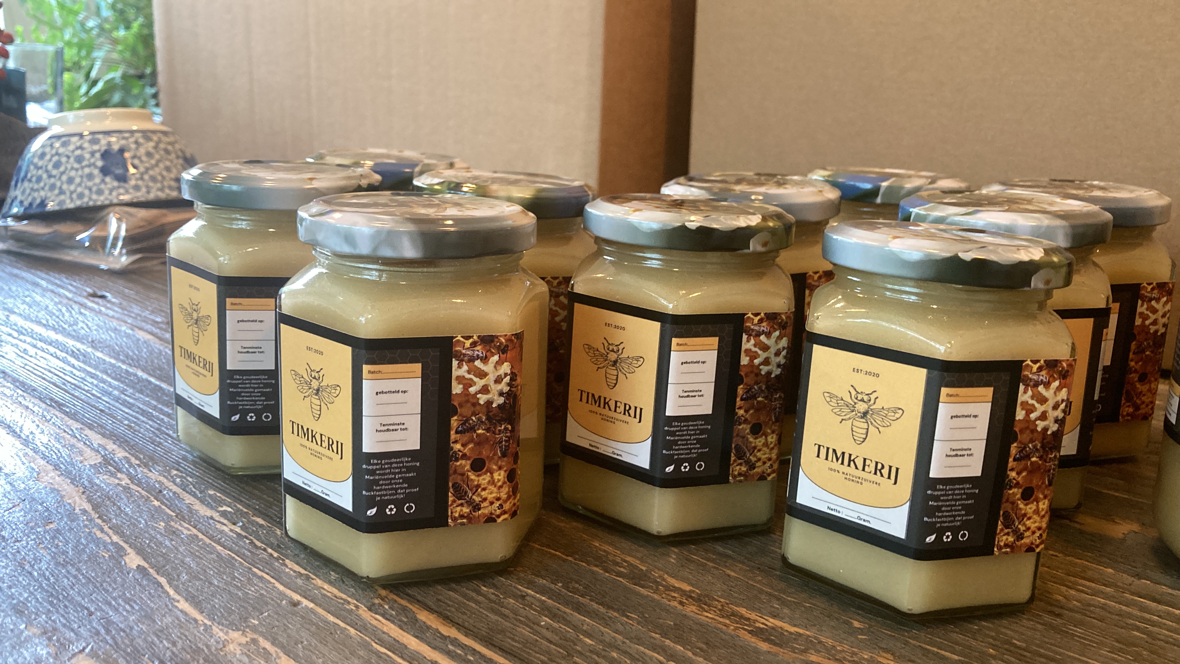 We hebben Klaverhoning (klaovertje vier), Linde/Acaciahoning (Grei uut Gaanderen), Kaneel/Crèmehoning (Crème de la Crème) en bloemenhoning (Bluumskes).